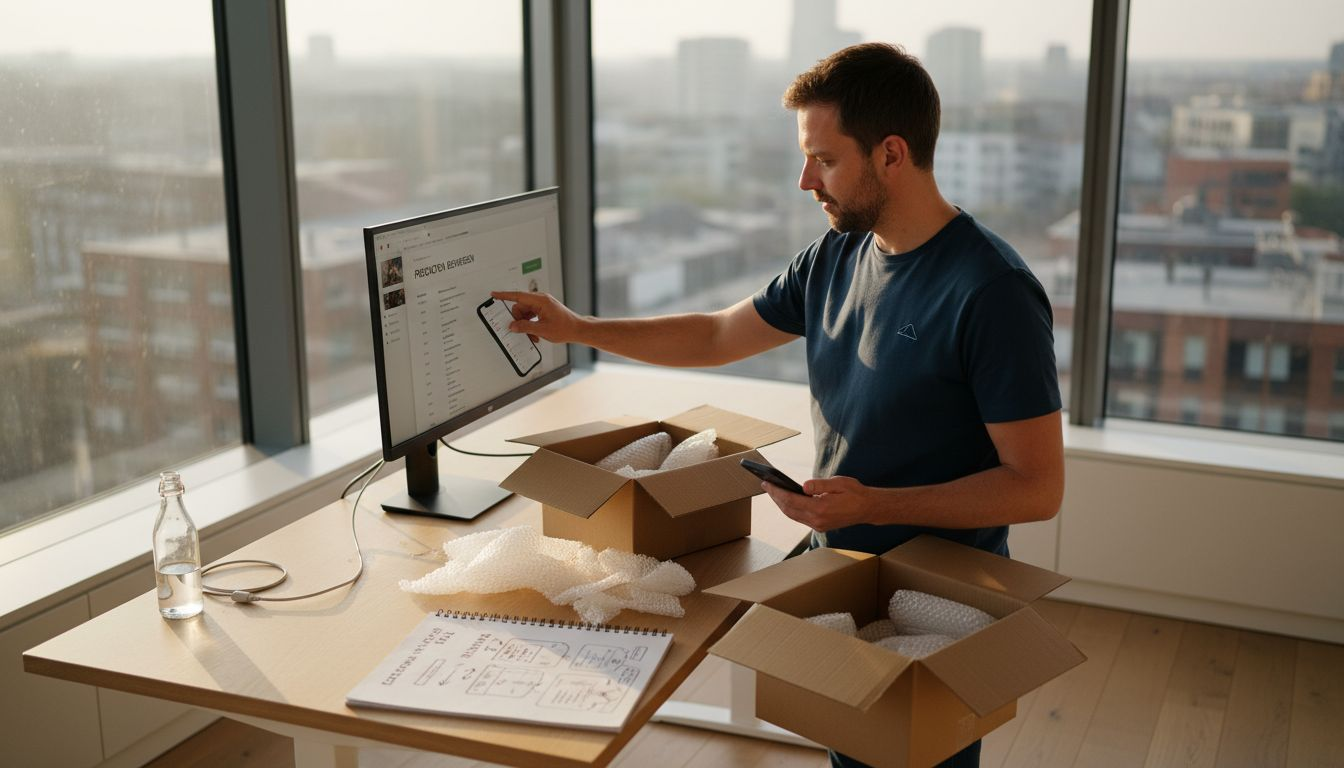7 Shopify groeisuccessen voorbeelden en hun strategieën ! Een Shopify-ondernemer die aan zijn bureau in de hoek bezig is met het updaten van producten.